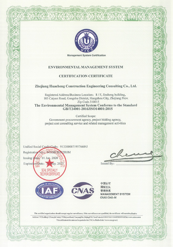 14001環境管理體系認證證書(中)